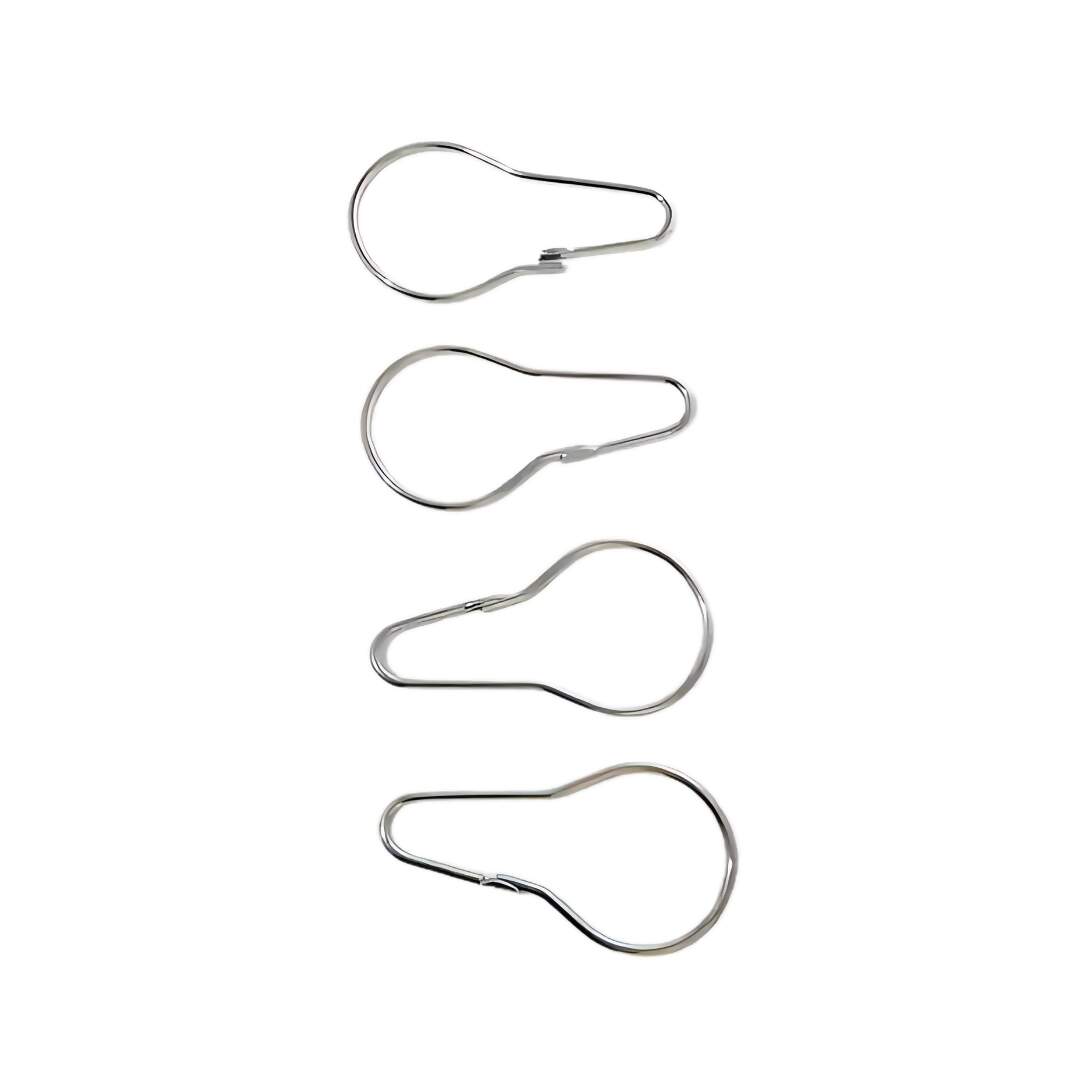 Gancho ou argola de metal para cortina de box. Argolas práticas que possuem abertura manual para encaixar no ilhós da sua cortina e também no varão para pendurar.