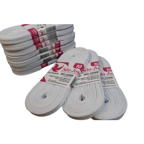 Cadarço Sarjado São José Ref.3008 Branco 8mm Pacote c/10un. Cadarço Sarjado, é feito com fibras naturais do algodão, o que o torna um cadarço mais leve e de fácil utilização. Bastante maleável, se destaca quando aplicado em projetos de artesanato e confecções, sejam elas de peças de roupas, com tecido mais leve ou mais robustos, trabalhos esse que necessitam de destaque em partes específicas para fazer reparos na costura, tornando-as mais firmes e fortes.100% algodão com excelente qualidade e resistência. Utilizado em confecções, reforço de costura, sacolas, bolsas, mochilas, sapatos, etc.