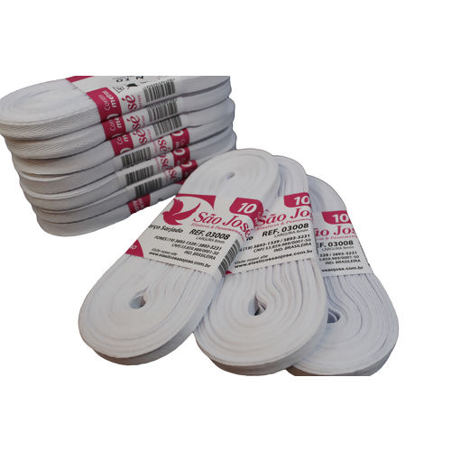 Cadarço Sarjado São José Ref.3008 Branco 8mm Pacote c/10un. Cadarço Sarjado, é feito com fibras naturais do algodão, o que o torna um cadarço mais leve e de fácil utilização. Bastante maleável, se destaca quando aplicado em projetos de artesanato e confecções, sejam elas de peças de roupas, com tecido mais leve ou mais robustos, trabalhos esse que necessitam de destaque em partes específicas para fazer reparos na costura, tornando-as mais firmes e fortes.100% algodão com excelente qualidade e resistência. Utilizado em confecções, reforço de costura, sacolas, bolsas, mochilas, sapatos, etc.