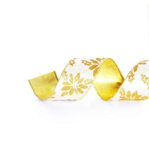 Fita de Natal Aramada Cromus Veludo Flores Marfim e Ouro 1613227 3,8cmx9,14m