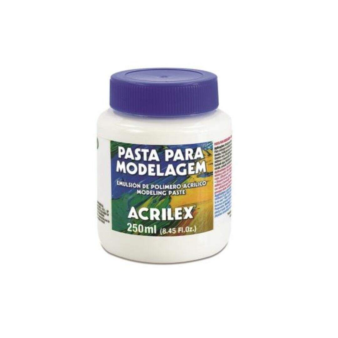Pasta para Modelagem Acrilex 250ml. Ideal para criar relevos, texturas, e fazer aplicações em objetos e materiais diversos como: telas de pintura, madeira, cerâmica, gesso e papelão. Após secagem, apresenta excelente durabilidade e flexibilidade. Solúvel em água, tem acabamento opaco e secagem completa em 72 horas. Possui um acabamento fosco e é solúvel em agua. Pode ser colorida com adição de tinta acrílica ou tinta artesanato.