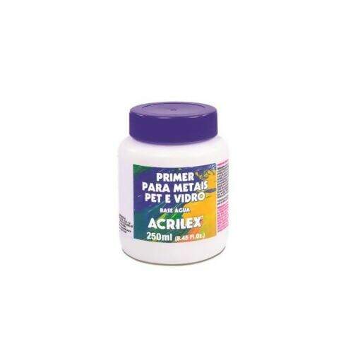 Primer para Metais Pet e Vidro 250ml. Produto a base de água que confere proteção contra corrosão em alumínio, ferro e superfícies galvanizadas. Utilizado também como base para Pet e Vidro, podendo ser pintado posteriormente com tintas Acrilex. A superfície a ser pintada deve estar limpa e seca. No caso de superfícies novas (polidas ou envernizadas), lixe a peça antes da aplicação. Excelente aderência, secagem entre 4 e 6 horas. Para aplicação de tintas a óleo ou base solvente, aguarde secagem de 24 horas.