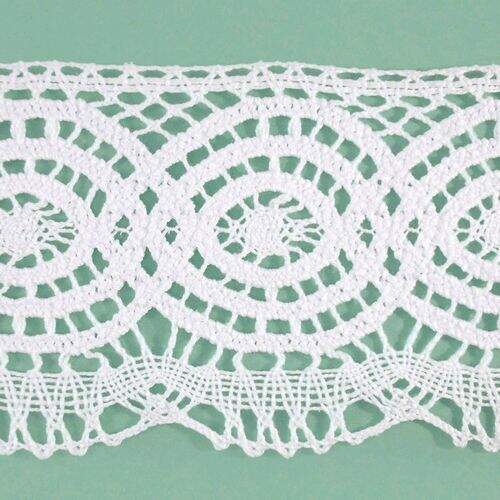 Renda em algodão, utilizada para artesanato, confecções, decoração e outros. Aceita tingimento.
