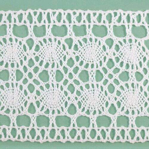 Renda em algodão, utilizada para artesanato, confecções, decoração e outros. Aceita tingimento.