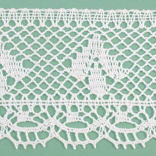 Renda em algodão, utilizada para artesanato, confecções, decoração e outros. Aceita tingimento.