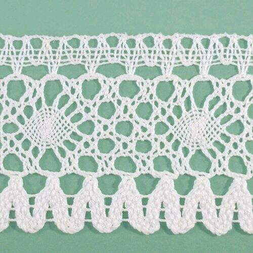 Renda em algodão, utilizada para artesanato, confecções, decoração e outros. Aceita tingimento.
