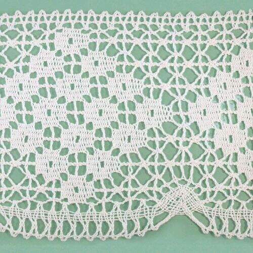 Renda em algodão, utilizada para artesanato, confecções, decoração e outros. Aceita tingimento.