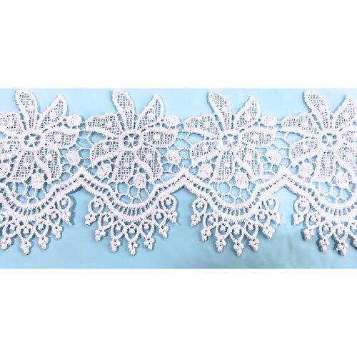 Aposte na elegância da Renda Guipir TY089! Com 8,5cm de largura, essa peça de 13,70m em 100% poliéster é ideal para acabamentos marcantes em roupas, moda e decoração sofisticada.