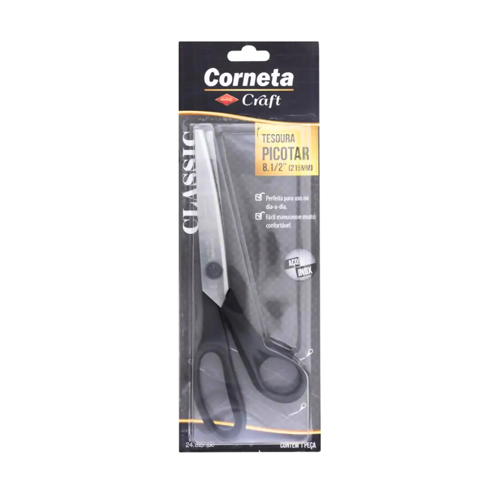 A Tesoura Corneta Classic 8½ Picotar 2482708 é a ferramenta ideal para quem busca acabamentos profissionais e cortes decorativos em tecidos e materiais diversos. Com 21 cm de comprimento total (8½”), proporciona cortes precisos e uniformes, criando efeitos em zig-zag que evitam desfiamento em tecidos e adicionam um toque decorativo às peças.