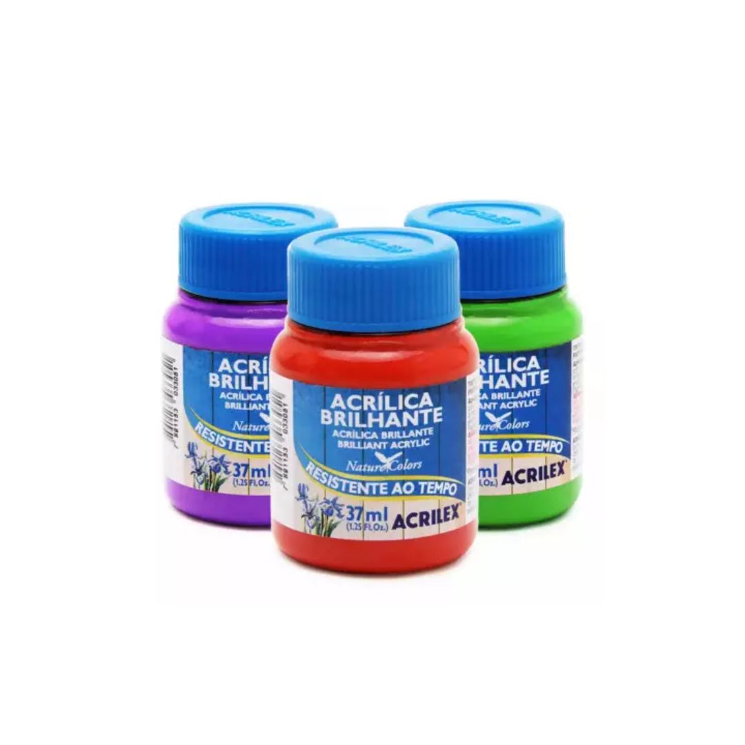 Tinta Acrílica Brilhante Nature Colors Acrilex 37ml. Indicada para pinturas artesanais sobre MDF, madeira, cerâmica, pedra, gesso, isopor, cortiça, couro, vidro, plásticos jateados, alumínio, latão e zinco, sempre com fins decorativos. Apresentada em 20 cores miscíveis entre si, possui acabamento brilhante, não havendo necessidade de aplicação de verniz. Caso seja diluída, pode perder o brilho. Nesse caso, é necessário aplicar mais de uma camada de tinta para obter o resultado desejado.