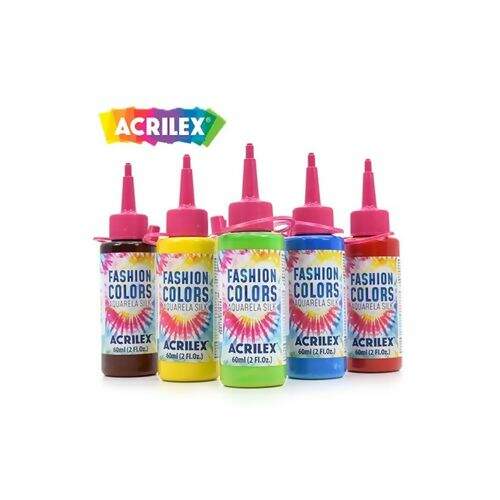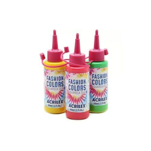 Tinta Fashion Colors Aquarela Silk Acrilex 60ml. Tinta líquida, com cores Fosca e Neon. Para tecidos de seda ou algodão, com fibras naturais e perfeita para a Técnica de Tie Dye. Não utilize em tecidos engomados.