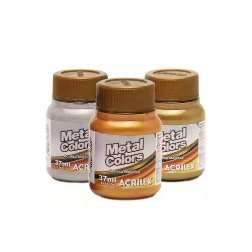 Tinta Metal Colors Acrilex 37ml. É ideal para trabalhos de artesanato. Pode ser aplicada sobre: madeira, cerâmica, gesso, papel, papelão, isopor, resina, cortiça, couro, vidro e plásticos jateados, alumínio, latão e zinco, sempre com fins decorativos. Formulada à base de resina acrílica, não tóxica e solúvel em água, a tinta Metal Colors apresenta secagem rápida com uma ótima aderência e resistência após secagem quando utilizada sobre materiais porosos e devidamente preparados. Possui cores miscíveis entre si, acabamento metálico e brilhante, não havendo a necessidade de aplicação de verniz.